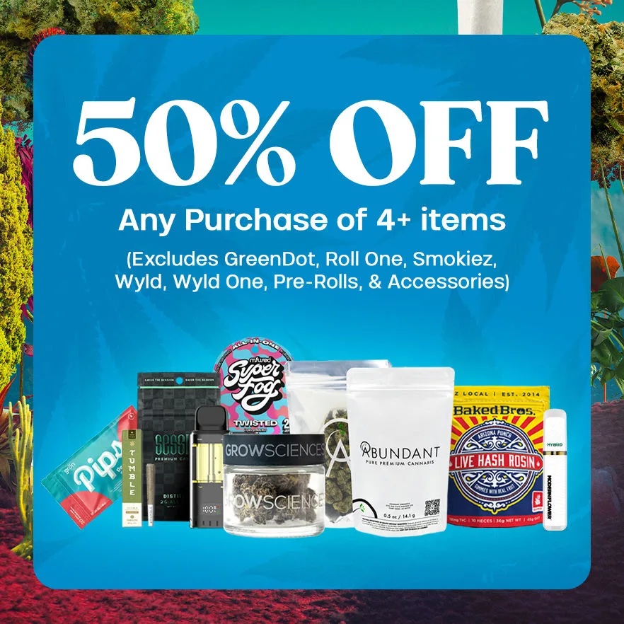| Buy Any 4+ Products - 50% Off ALL Products (Mix & Match) (Excludes GreenDot, Roll One, Smokiez, Wyld, Wyld One, Pre-Rolls, & Accessories) |