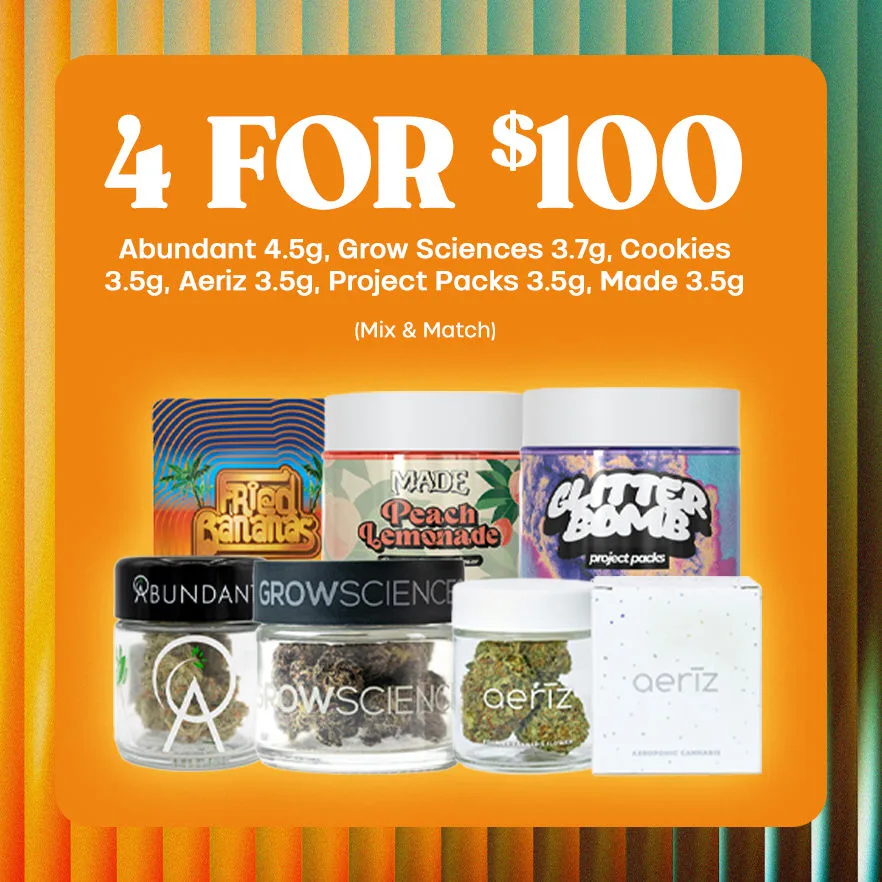 | 4 FOR $100 On Abundant 4.5g, Grow Sciences 3.7g, Cookies 3.5g, Aeriz 3.5g, Project Packs 3.5g, Made 3.5g (Mix and Match) |