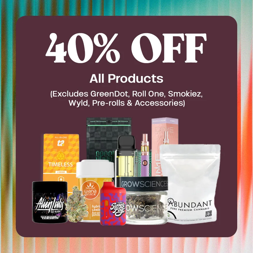 | SUNDAY SCORE - 40% Off ALL Products (Excludes GreenDot, Roll One, Smokiez, Wyld, Wyld One, Pre-Rolls, & Accessories) |