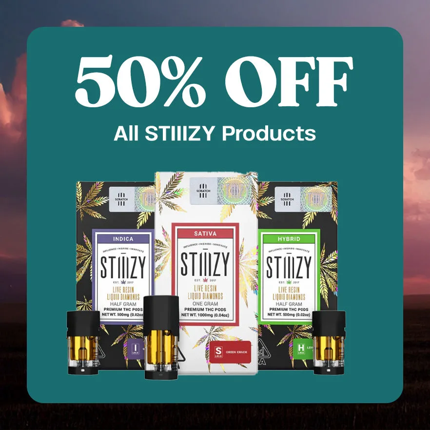 Half off your favorite STIIIZY essentials. From pods to pre-rolls, enjoy powerful potency, smooth flavor, and premium quality crafted for every vibe.
