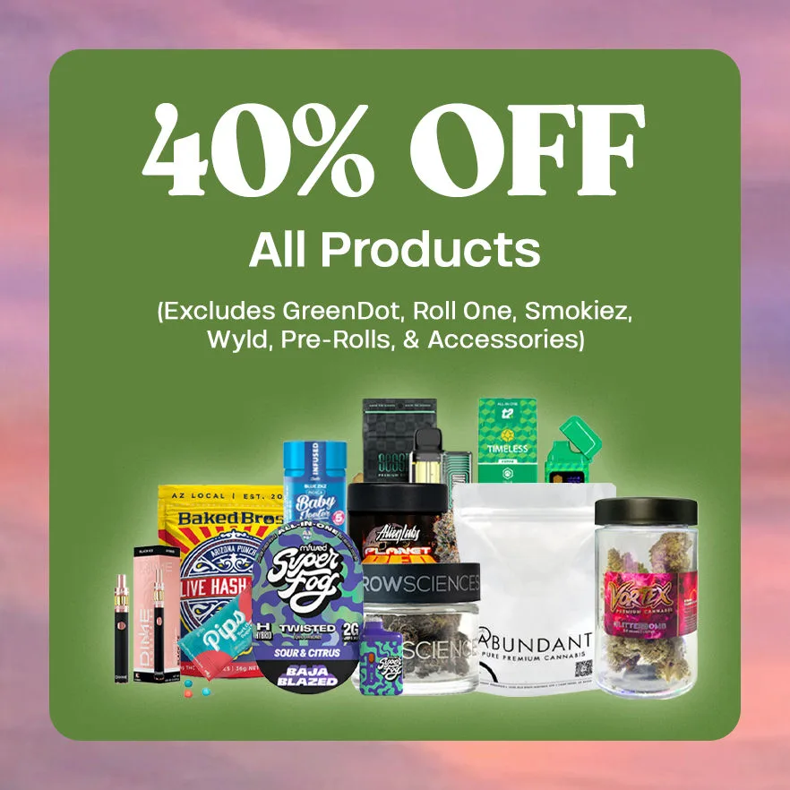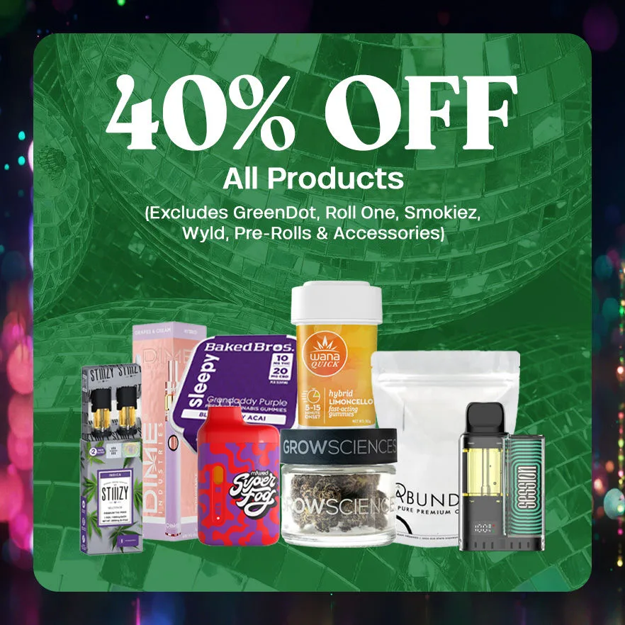 | SUNDAY SCORE - 40% Off ALL Products (Excludes GreenDot, Roll One, Smokiez, Wyld, Wyld One, Pre-Rolls, & Accessories) |