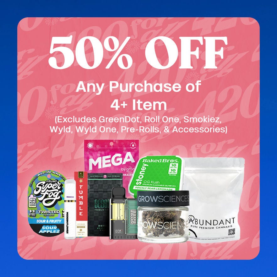 Get half off on the full lineup—vapes, pre-rolls, and flower.