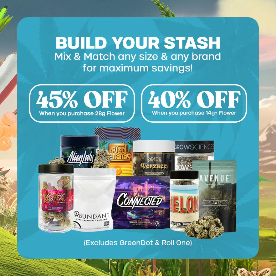 | BUILD YOUR STASH - 14g Flower 40% Off (14g units or 4 x 3.5g etc.)OR 45% Off 28g (2 x 14g or 8 x 3.5g or 14g + 4(3.5g) etc) (Excludes GreenDot & Roll One) |