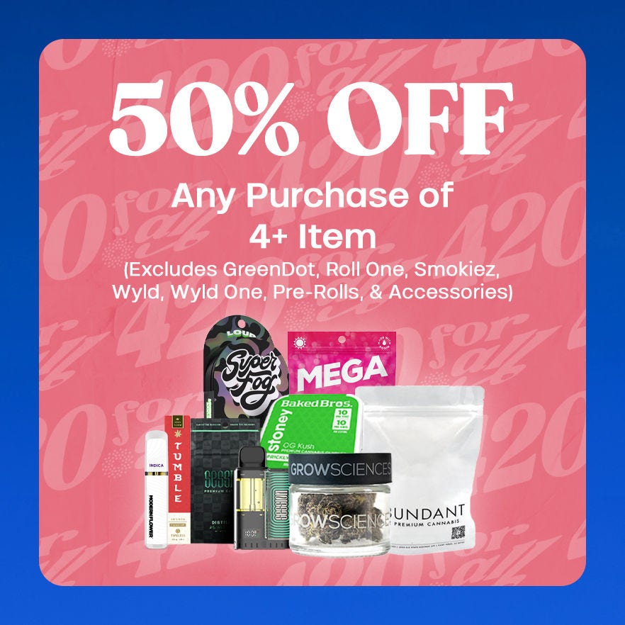 Get half off on the full lineup—vapes, pre-rolls, and flower.