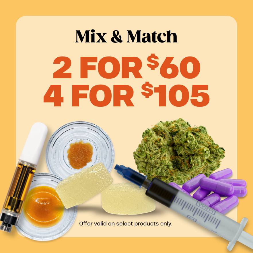 Unwind and save with 2 for $60 or 4 for $105 on select favorites — including 3.5g Flower from Modern Flower, Binske, Sunshine Cannabis, Delisioso, and Black Tuna, plus Live Rosin Gummies, RSO Syringes, Capsules, and Modern Flower Live Concentrates. Your perfect midweek pick-me-up starts here!