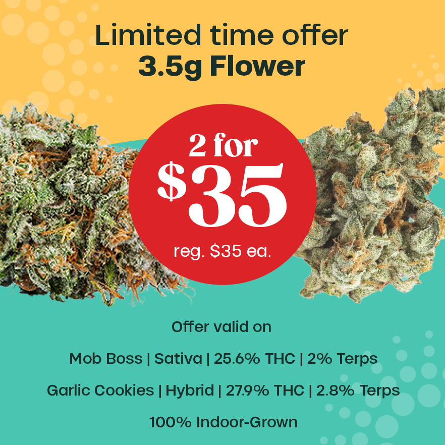 Trulieve 3.5g flower Mob Boss and Garlic Cookies team up for a bold, flavorful duo — now 2 for $35. This pair brings standout effects and classic Trulieve quality.