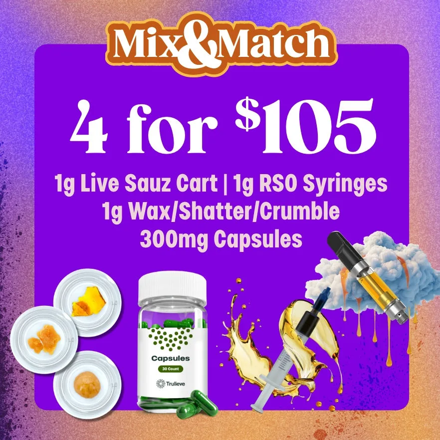 Mix and match four select items for $105. Choose from Live Sauz Carts, RSO syringes, wax, shatter, crumble, and 300mg capsules. Build your perfect midweek bundle.