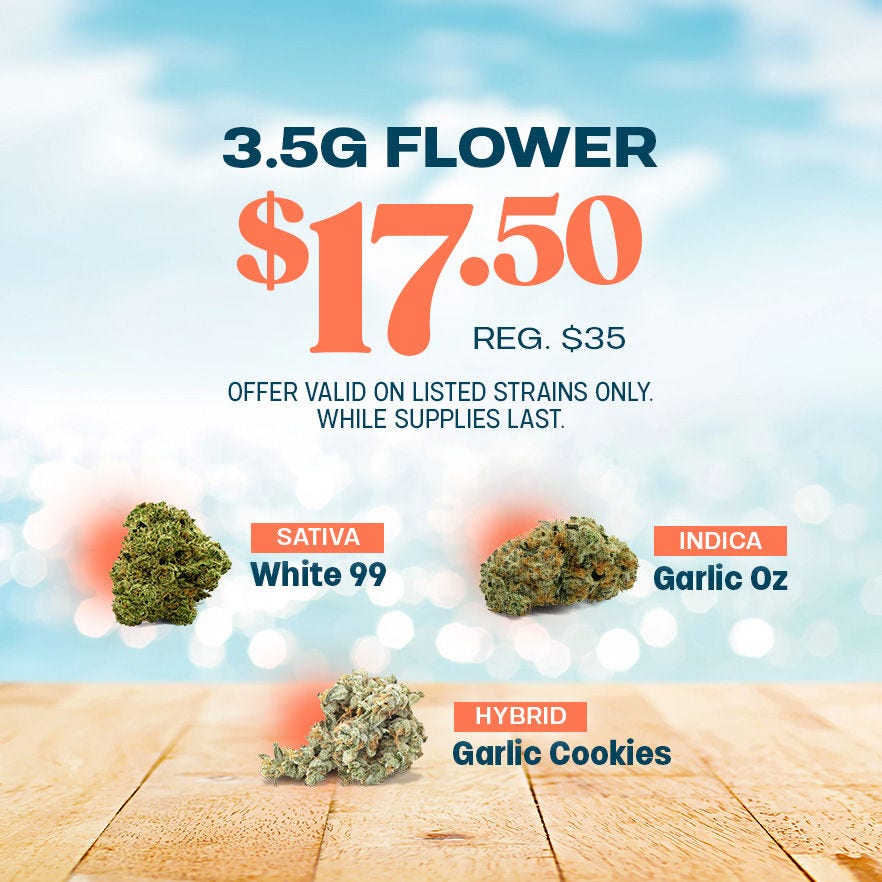 Shop select 3.5g whole flower for $17.50. Choose Roll One White 99, Garlic OZ, or Garlic Cookies for quality buds at great value.