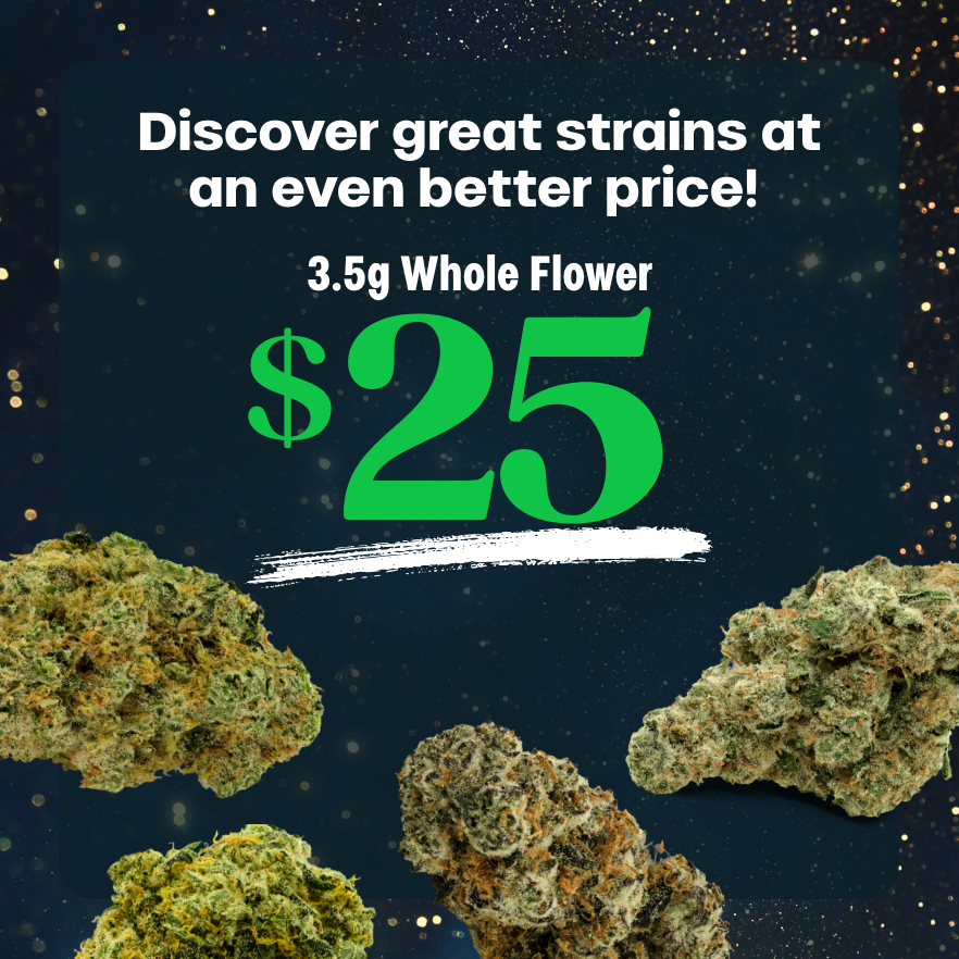 Select 3.5g flower strains are now just $25. Potent, indoor‑grown picks with strong THC and terp profiles—priced to make treating yourself easy.