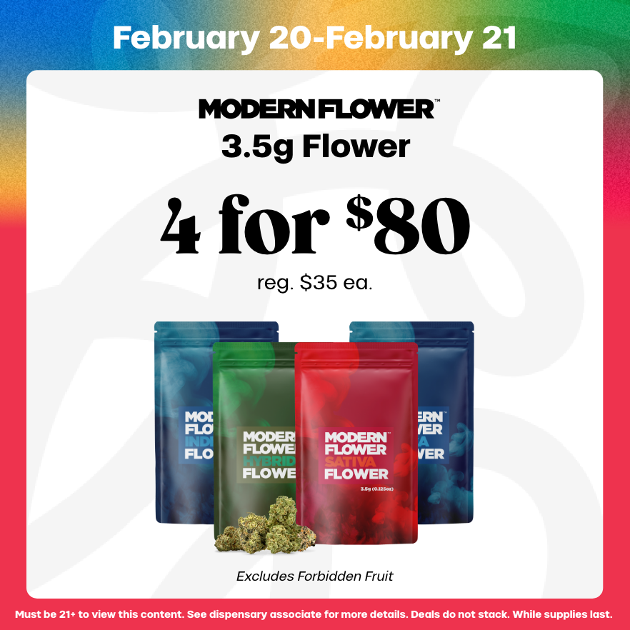 Grab four Modern Flower 3.5g jars for $80 on Feb 20–21—a fast way to stock up across Indica, Hybrid, and Sativa.