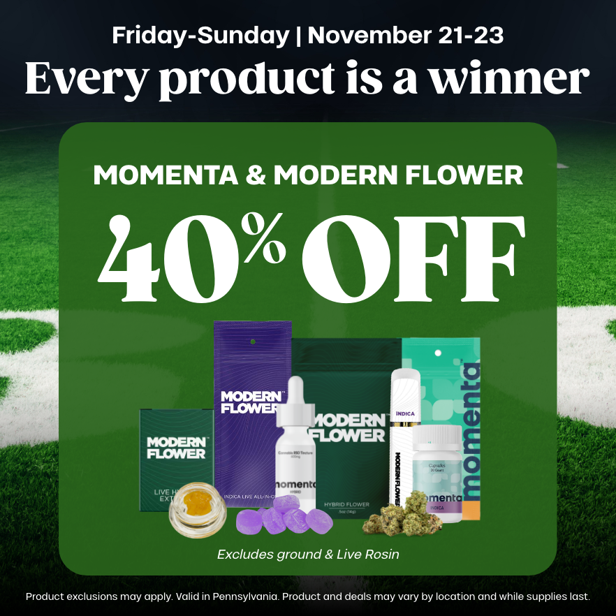 Cozy up with premium quality at a price you’ll love. Enjoy 40% off Modern Flower & Momenta products (excludes ground and live rosin). Stock up on your favorite essentials while this limited-time offer lasts.