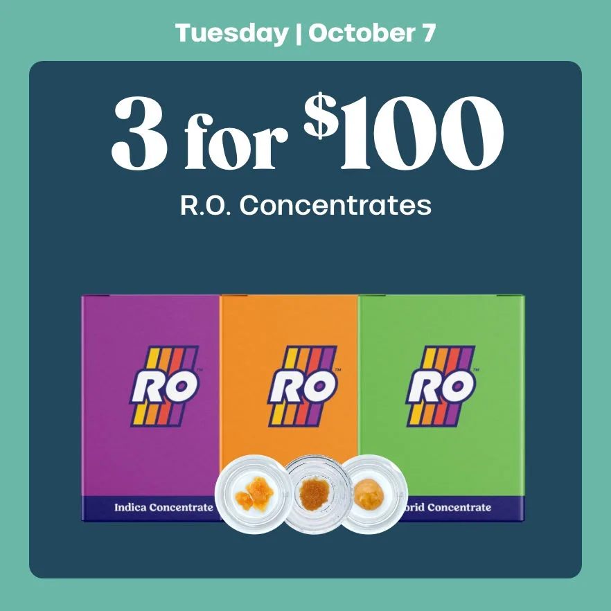 This Tuesday, elevate your experience with a trio of premium R.O. Concentrates (available in Indica, Sativa, and Hybrid), all for just $100.